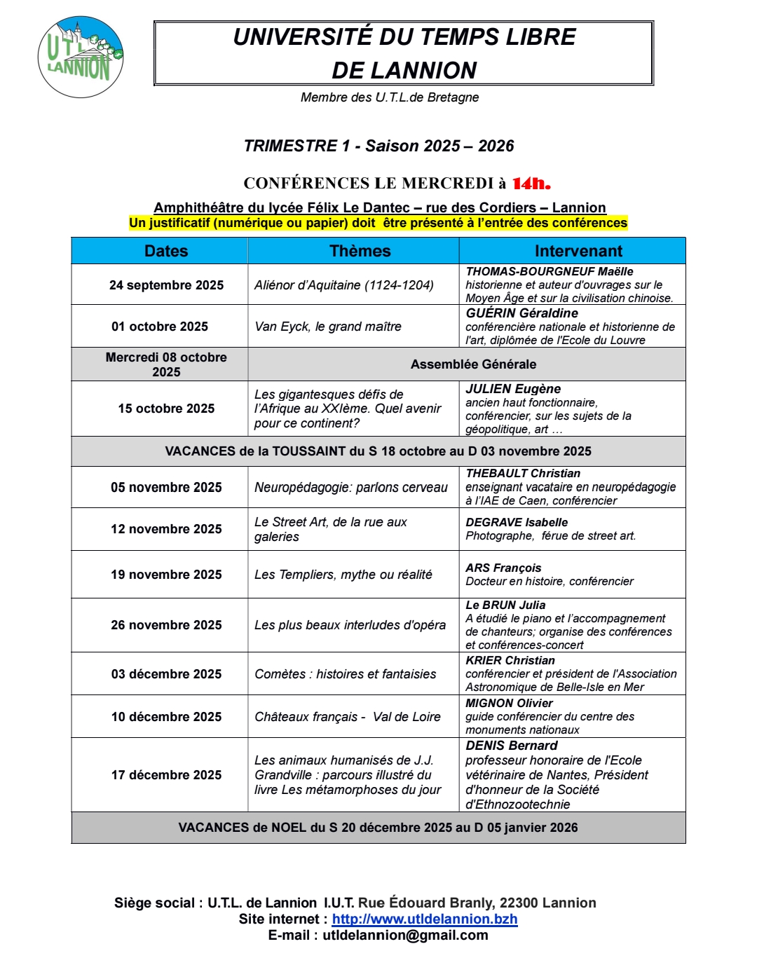 Vous trouverez ci-joint le programme proposé pour le premier trimestre de la saison 2025/2026